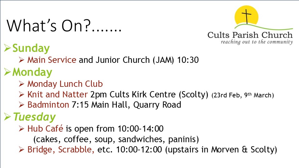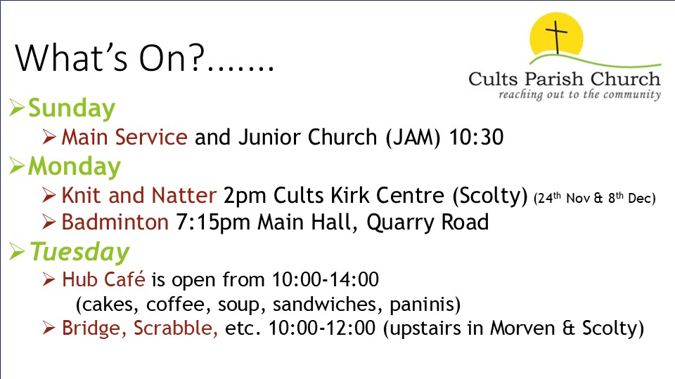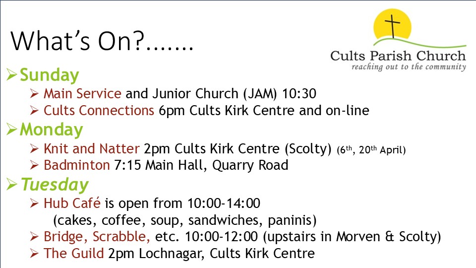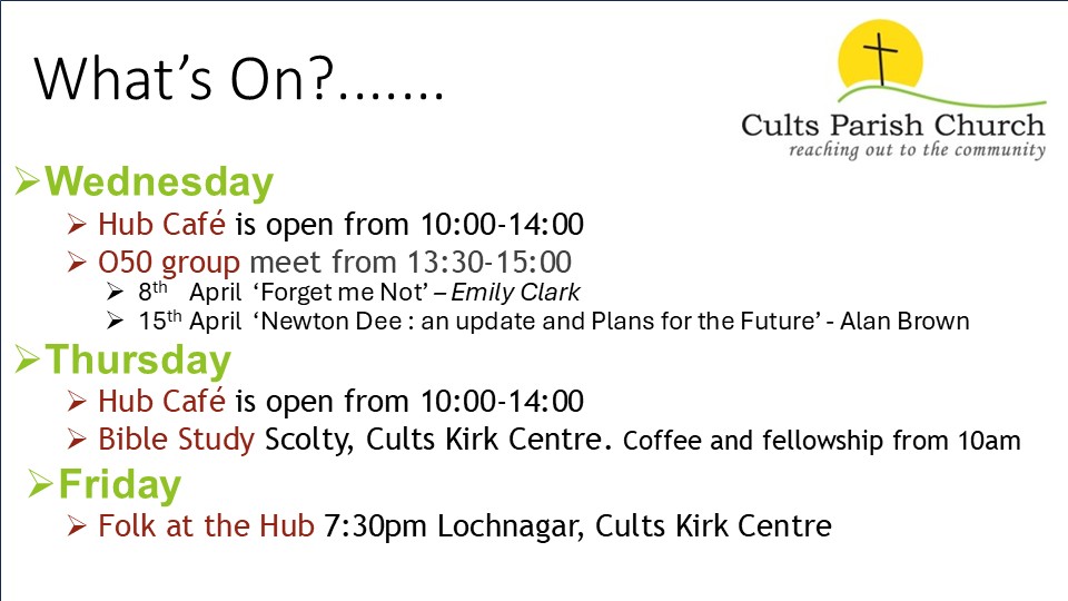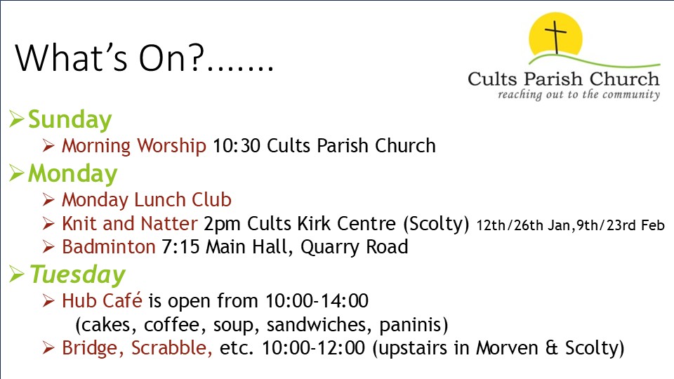 Remember all those “maybes”? Well, if you recognise yourself in any of them, Cults Kirk would like to welcome you. Call us on 01224 869028 if you can't find what you are looking for.